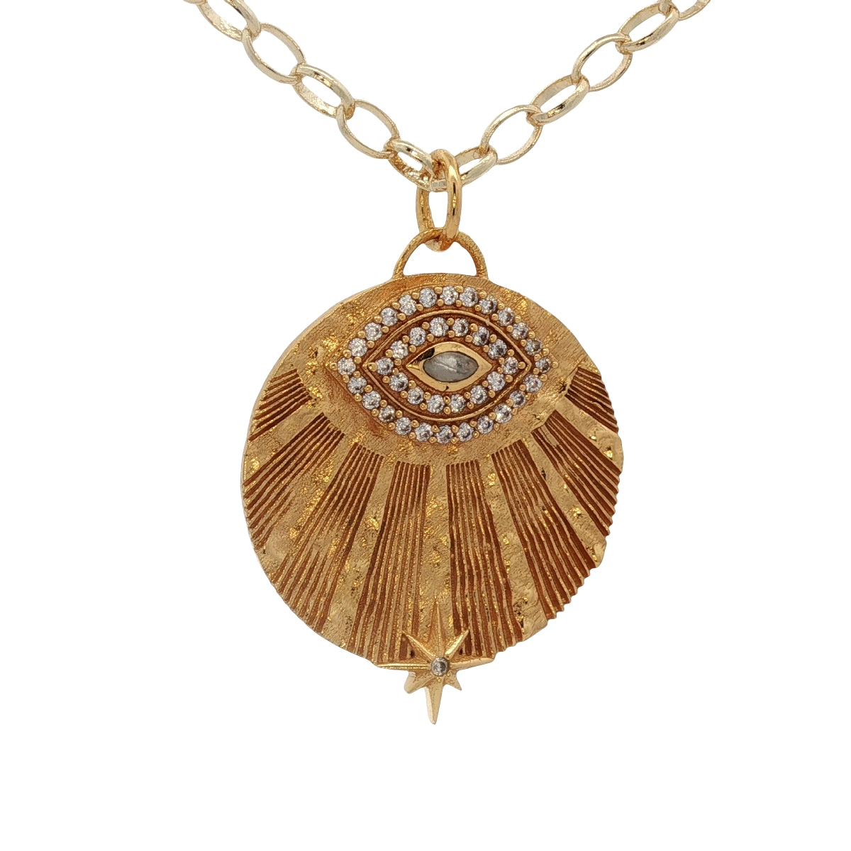Collier doré médaille striée oeil labradorite et zircons 42 cm
