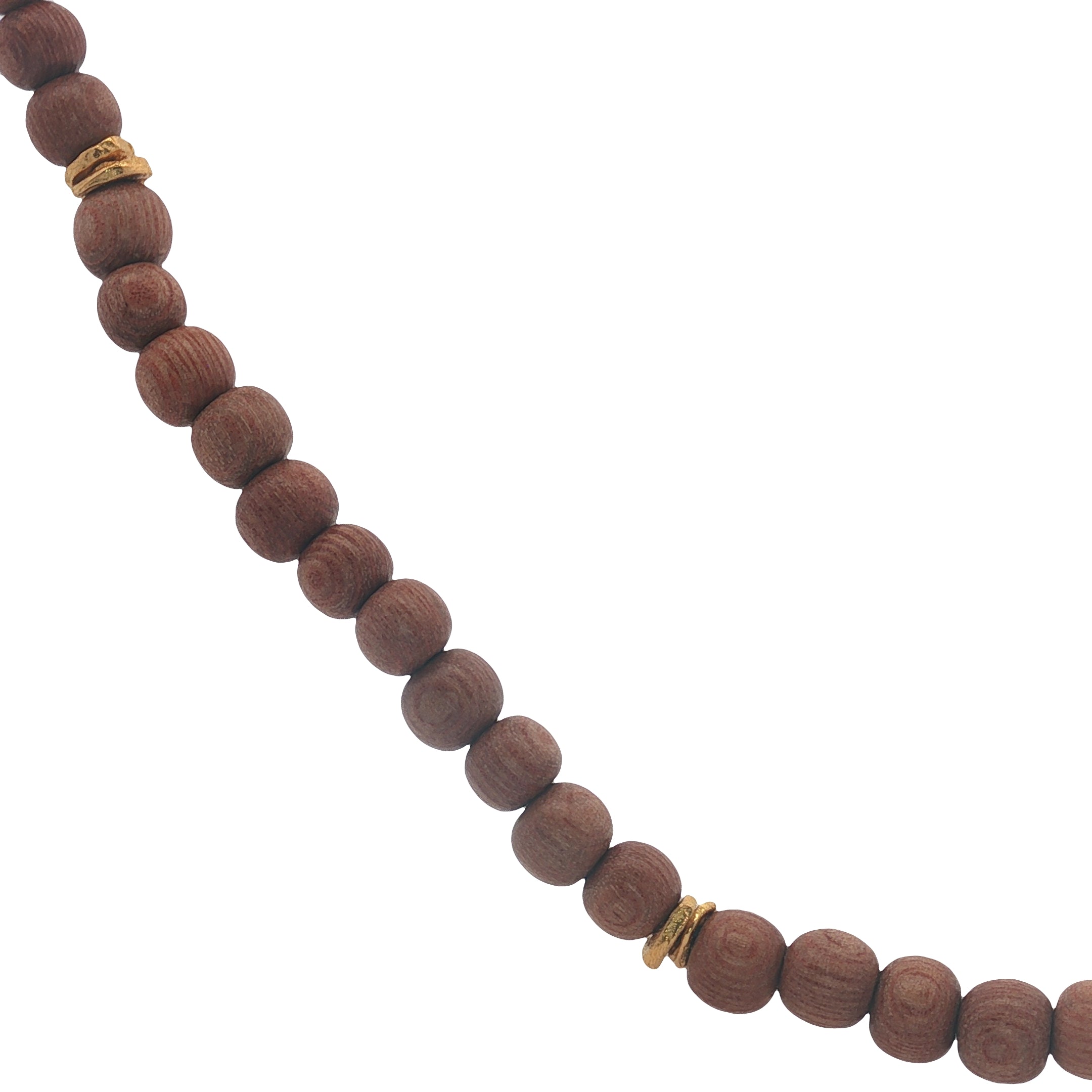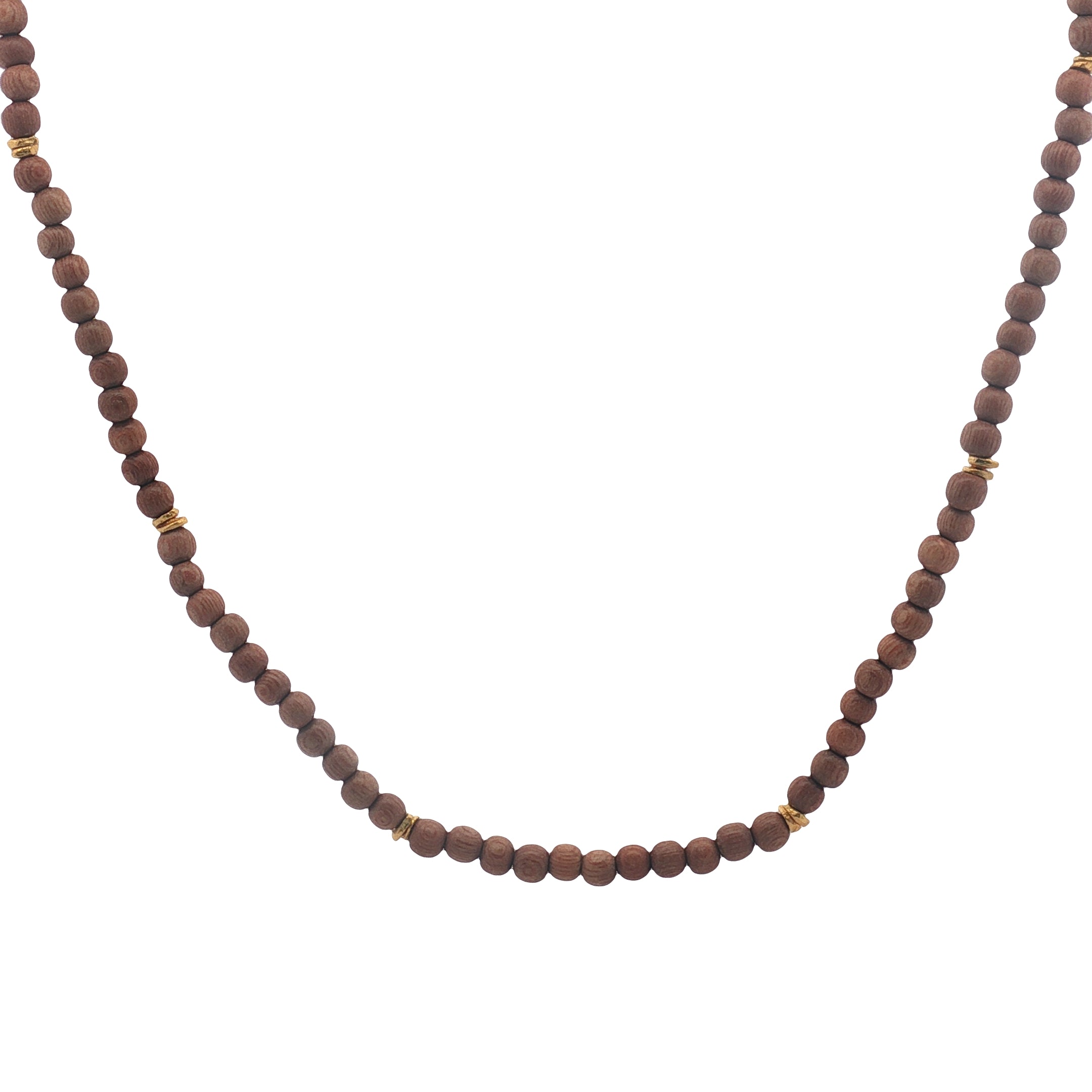 Collier avec perles en bois naturel marron clair espacées de disques martelés dorés