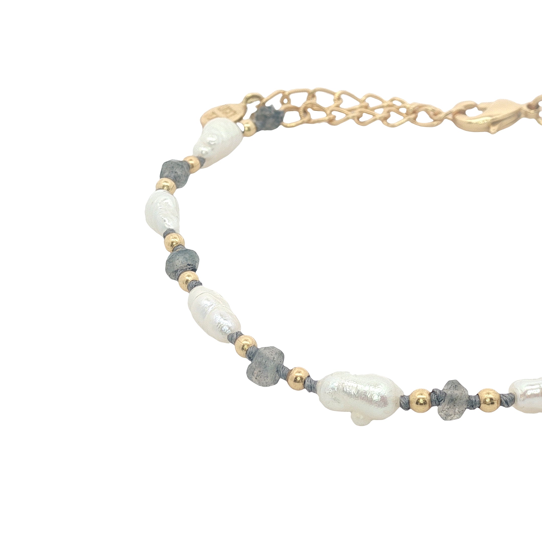 Bracelet avec alternance de perles de culture irrégulières, perles dorées, labradorite et noeuds bleus