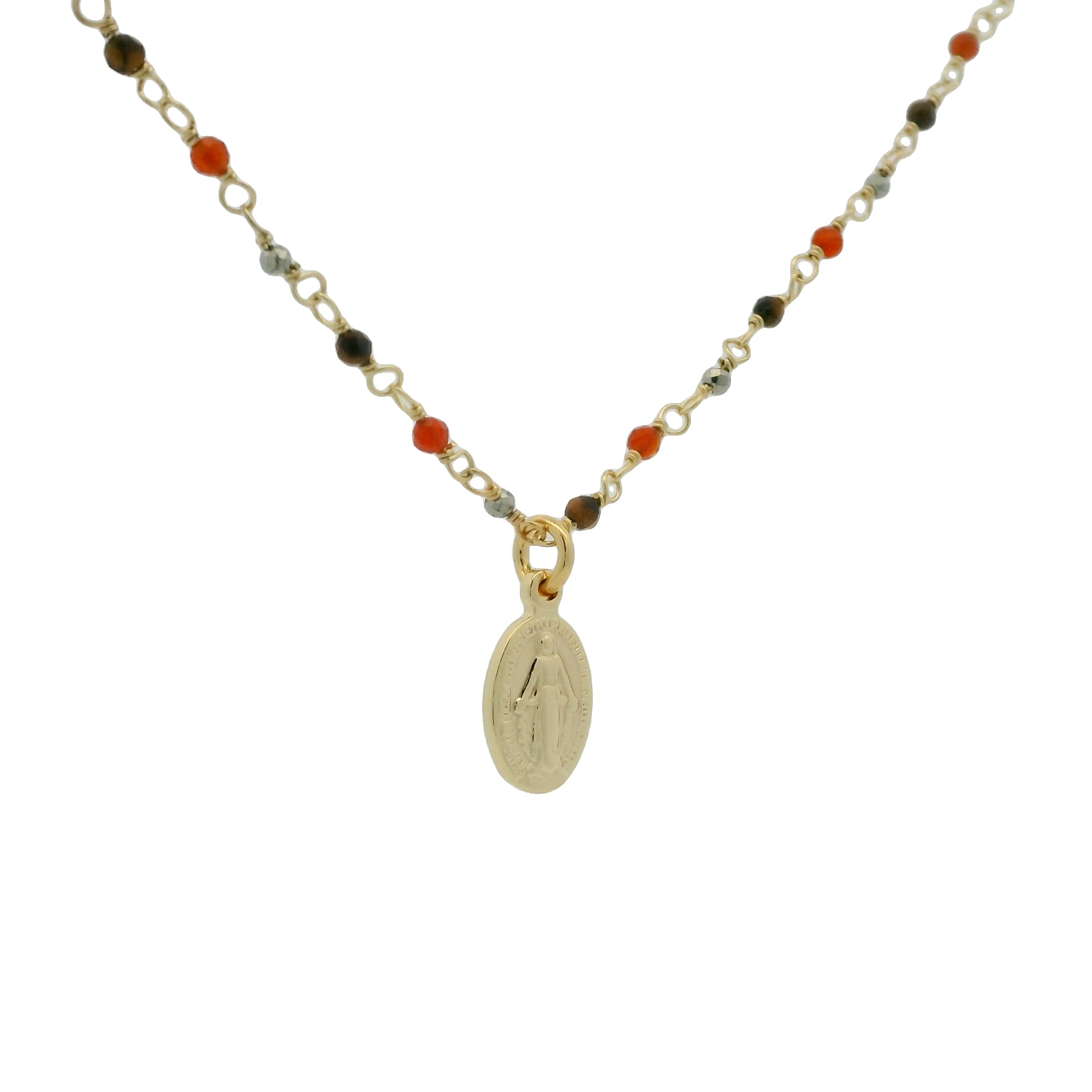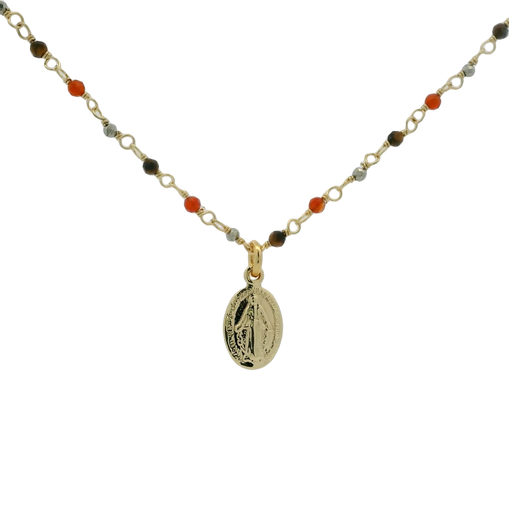 Collier doré santa Maria onyx rouge oeil de tigre et madone 38 cm