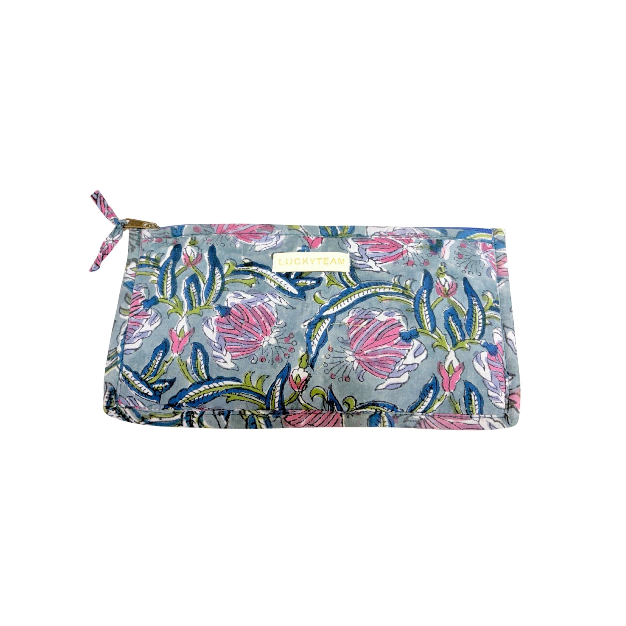 Petite pochette Block Print bleue à fleurs roses et violettes : 26 cm x 13 cm