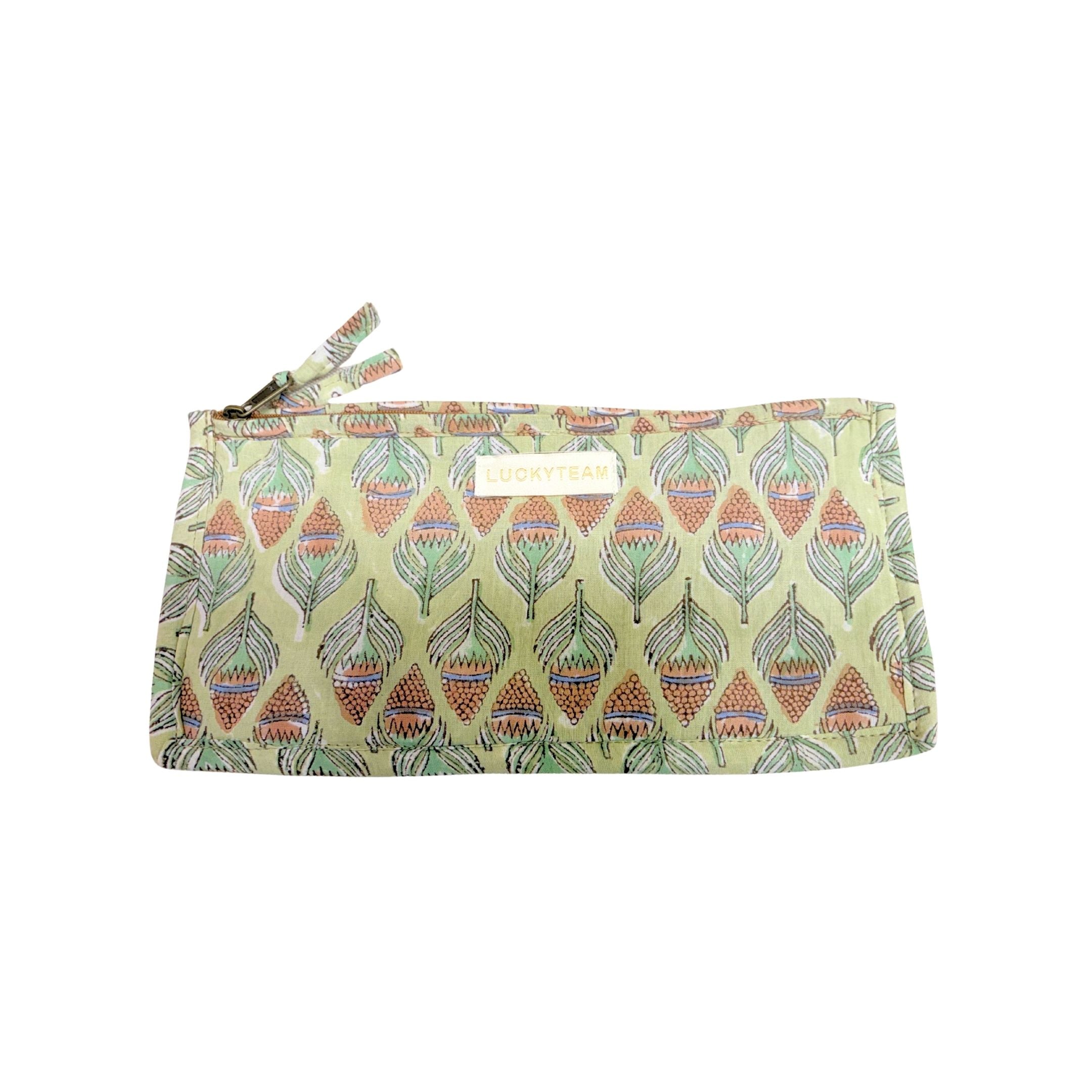 Petite pochette Block Print verte à fleurs oranges : 26 cm x 13 cm